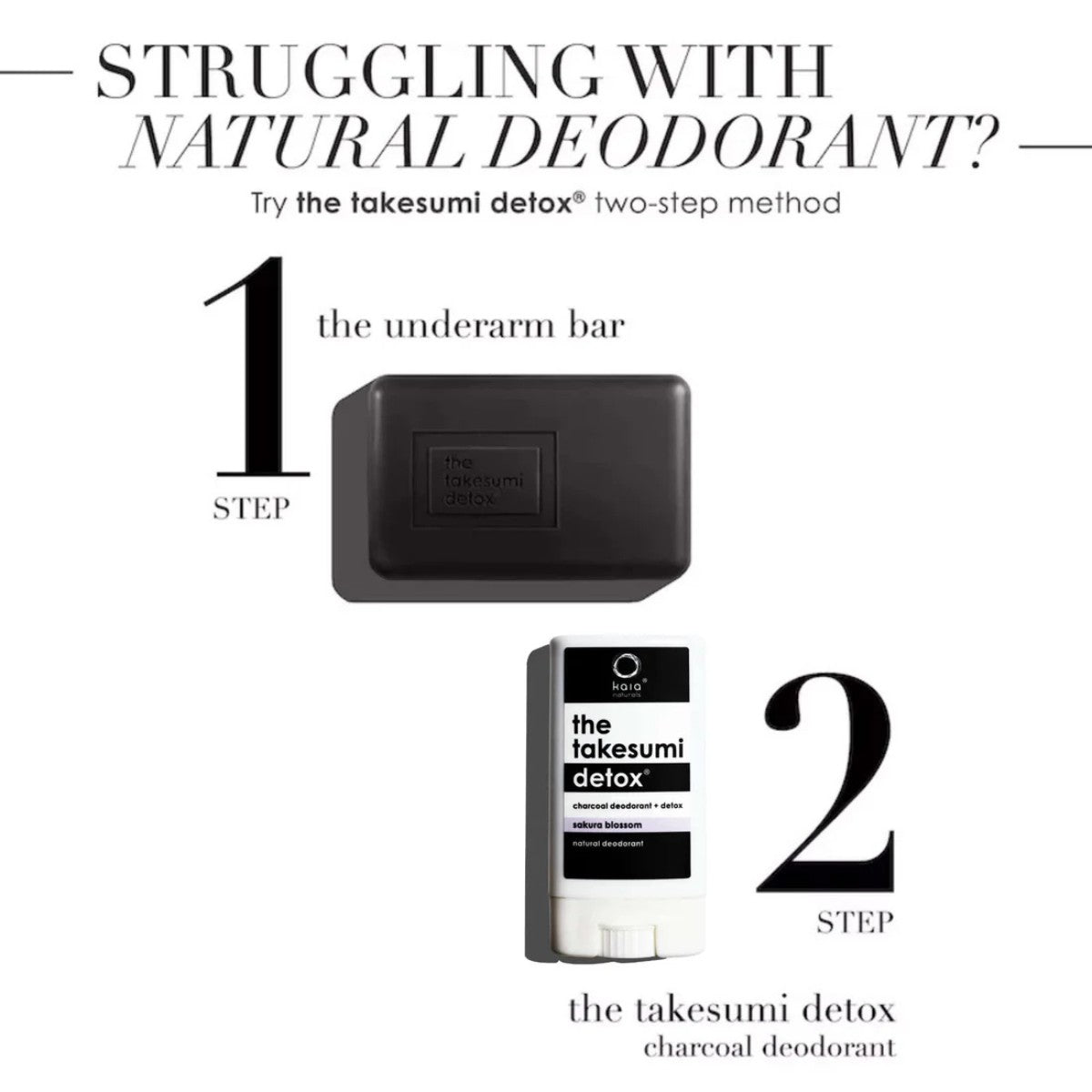 Made in Canada | Product Size: Takesumi Detox Underarm Bar 68 g / 2.4 oz, Takesumi Detox Sakura Blossom 12 g / 0.42 oz.